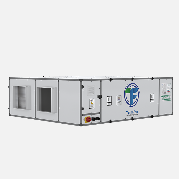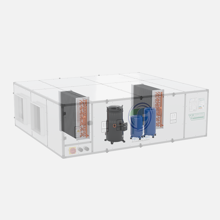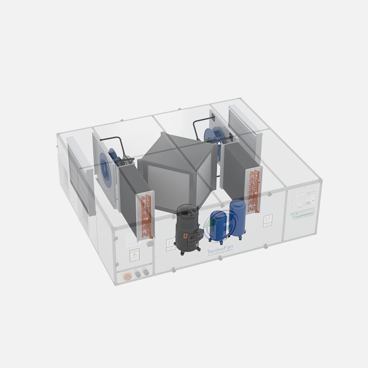 - Компактная конструкция, вся система в одном корпусе (вентилятор приточного воздуха + вытяжной вентилятор + рекуператор тепла + испаритель + конденсатор + компрессор + холодильное оборудование).